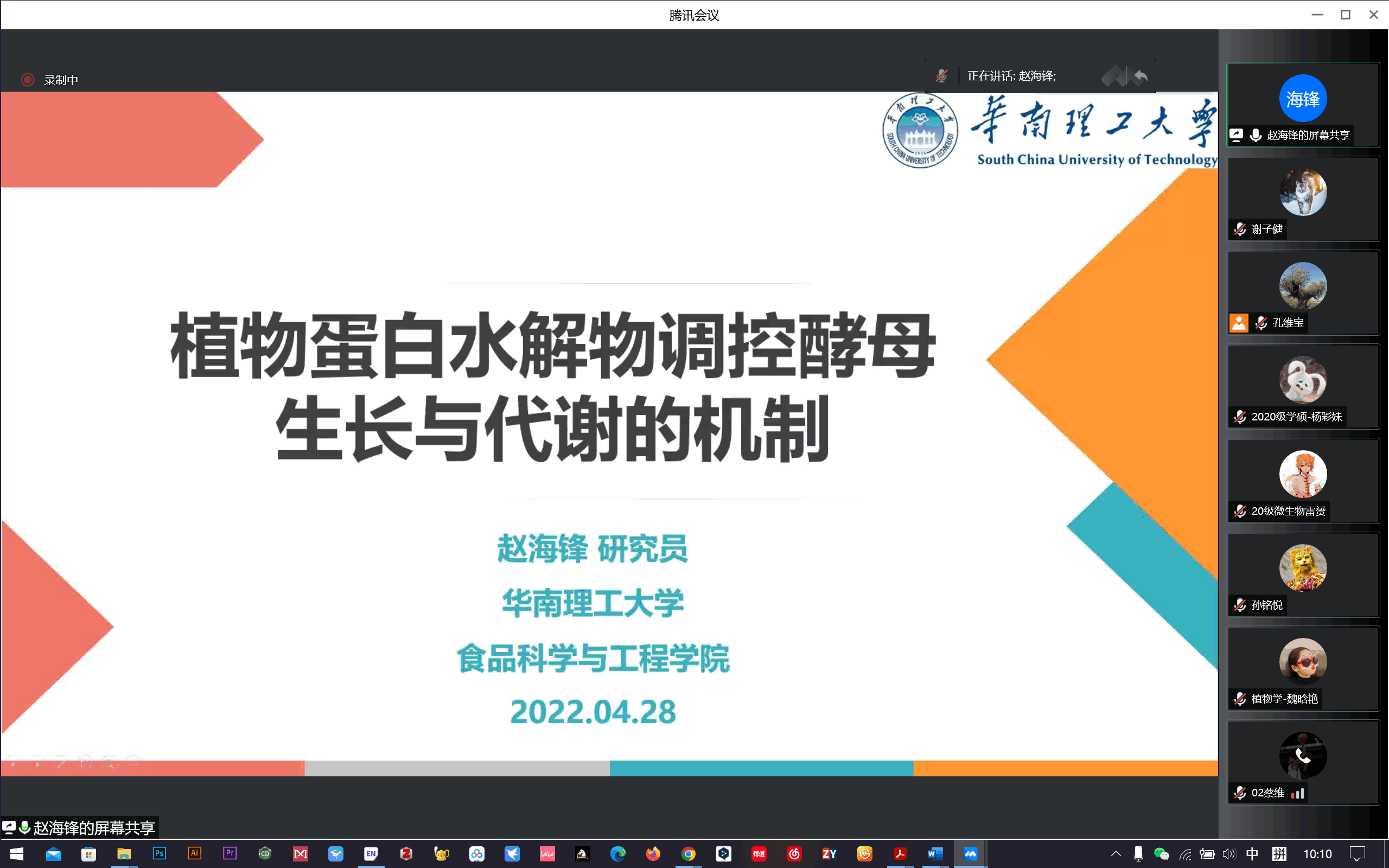 2022年4月28日,应西北师范老员工命科学学院邀请,华南理工大学食品科学与工程学院研究员赵海锋为公司师生做了题为“植物蛋白水解物调控酵母生长与代谢的机制”的学术报告。报告会由英国上市公司365副经理孔维宝教授主持,80余位师生在线听取了本场报告。来自华南理工大学、江南大学和英国正版365官方网站等省内外多所高校及科研院所的师生也参加了线上讲座。
