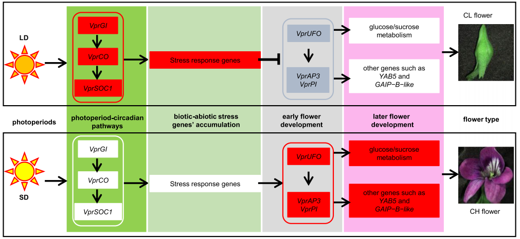 近日,李巧峡课题组与合作者通过转录组学方法比较了早开堇CH与CL花不同发育阶段基因的表达模式,得出光周期途径中的转录因子协同昼夜节律、花器官身份、糖脂代谢以及抗逆或防御反应调控了CH与CL花发育的结论。研究表明,CL花中与昼夜节律和促进开花相关基因(如GI、CO和SOC1)的表达量高于CH花,而CH花中促进花瓣与雄蕊启动和发育相关基因(如UFO和 B功能MADS-box 基因)的表达量高于CL花。此外,短日照能促进早开堇中糖酵解、脂肪酸生物合成与蔗糖的合成,其相关基因与AP3和PI共表达;同时GI和其它昼夜节律相关的基因与抗生物或非生物胁迫基因共表达,且这些抗逆基因可能会抑制AP3和PI或UFO的表达,负调控花瓣雄蕊的发育。本研究揭示了早开堇CH与CL花发育相关的动态分子调控网络,为理解环境驱动两型花的进化发育机制提供了理论依据。