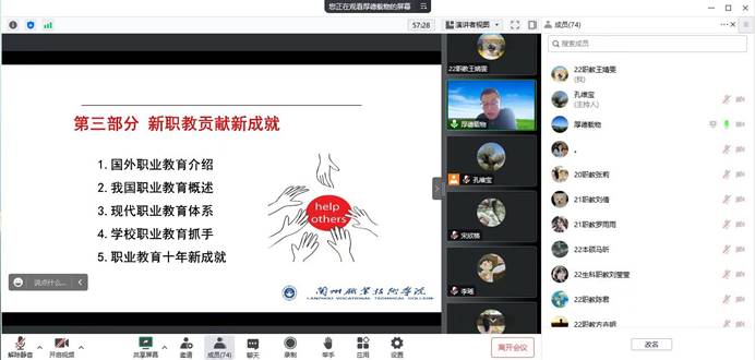 乘风好去新时节,职教新人扬风帆。为帮助公司职业技术教育专业硕士研究生更全面地了解我国职业教育的现状与发展前景,更好地找准自身定位,树立远大的职业发展目标,11月13日上午,学院邀请优秀员工、甘肃省职业教育名师、兰州职业技术学院生物工程系主任赵凤舞教授,为全体职业技术教育专业硕士研究生做了题为“新时代、新业态、新使命、新职教”的职业教育专题辅导报告。本次报告会由副经理孔维宝教授主持,110余位师生线上参加了学习和交流。