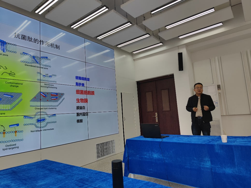 在学术报告环节,缑三虎副教授以 "新型抗菌肽和肽基抗菌材料的设计、改造与构效关系研究" 为题,系统介绍了抗菌肽在耐药菌防治领域的前沿进展。缑副教授深入阐释了新型抗菌肽的设计原理与改造策略,通过精准调控氨基酸序列、创新引入特殊结构等技术手段,显著提升了抗菌肽的稳定性与抗菌活性。在构效关系研究方面,缑副教授还分享了团队最新科研成果,深度解析了抗菌肽结构与抗菌活性之间的内在关联,为开发更高效的抗菌药物奠定了坚实的理论基础。